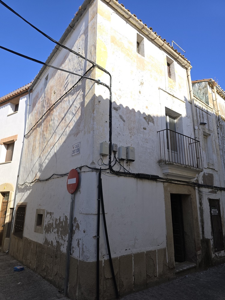 VIVIENDA. C/ SANTIAGO, 5. BROZAS (CÁCERES). Venta de vivienda de pueblo en esquina, con dos fachadas a calle en la zona céntrica de Brozas (Cáceres), a 45 km de Cáceres y a 35 de Portugal, en un municipio con gran riqueza arquitectónica. La vivienda dispone de dos plantas de altura, con una superficie construida aproximada de 144 m2 (según catastro). La planta baja dispone de un gran recibidor, tres dormitorios y un trastero. En la planta primera hay un salón, una cocina, un dormitorio y un baño. Al tratarse de una vivienda en esquina, tiene la posibilidad de ventanas en casi todas las estancias, además de poder hacer un patio a nivel de planta primera. Se trata de una vivienda antigua de pueblo, con los encantos que ello conlleva, necesitando obras de adecentamiento para entrar a vivir, pero con muchas posibilidades.